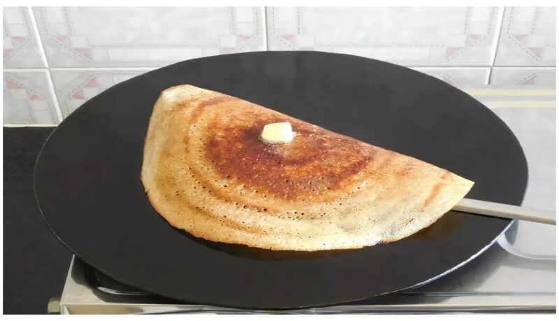 Oil or Ghee: Drizzle a little oil or ghee around the dosa and roast it on a low flame until it turns fully red. There is no need to flip the dosa.